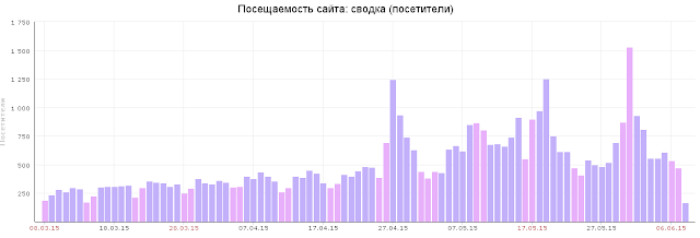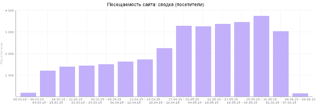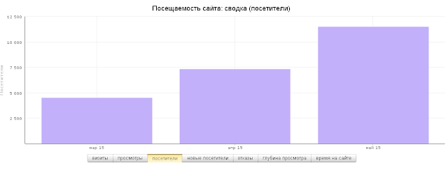 В марте на Ольшанке появился новый редактор и ... понеслось. В мае 2015 на Ольшанке побывали 11 522 уникальных посетителя (согласно счетчику Яндекс.Метрика), которые совершили 29 627 визитов на сайт и просмотрели сайт 102 723 раз. И за 10 тысяч в месяц зашли и за 100 тысяч просмотров тоже. Результат, прямо скажем, впечатляющий. Ниже графики, из которых видно как росла и менялась посещаемость. Там в дневном разделе месяц май, в дневном разделе квартал, квартал в недельном разрезе и квартал в месячном разрезе.